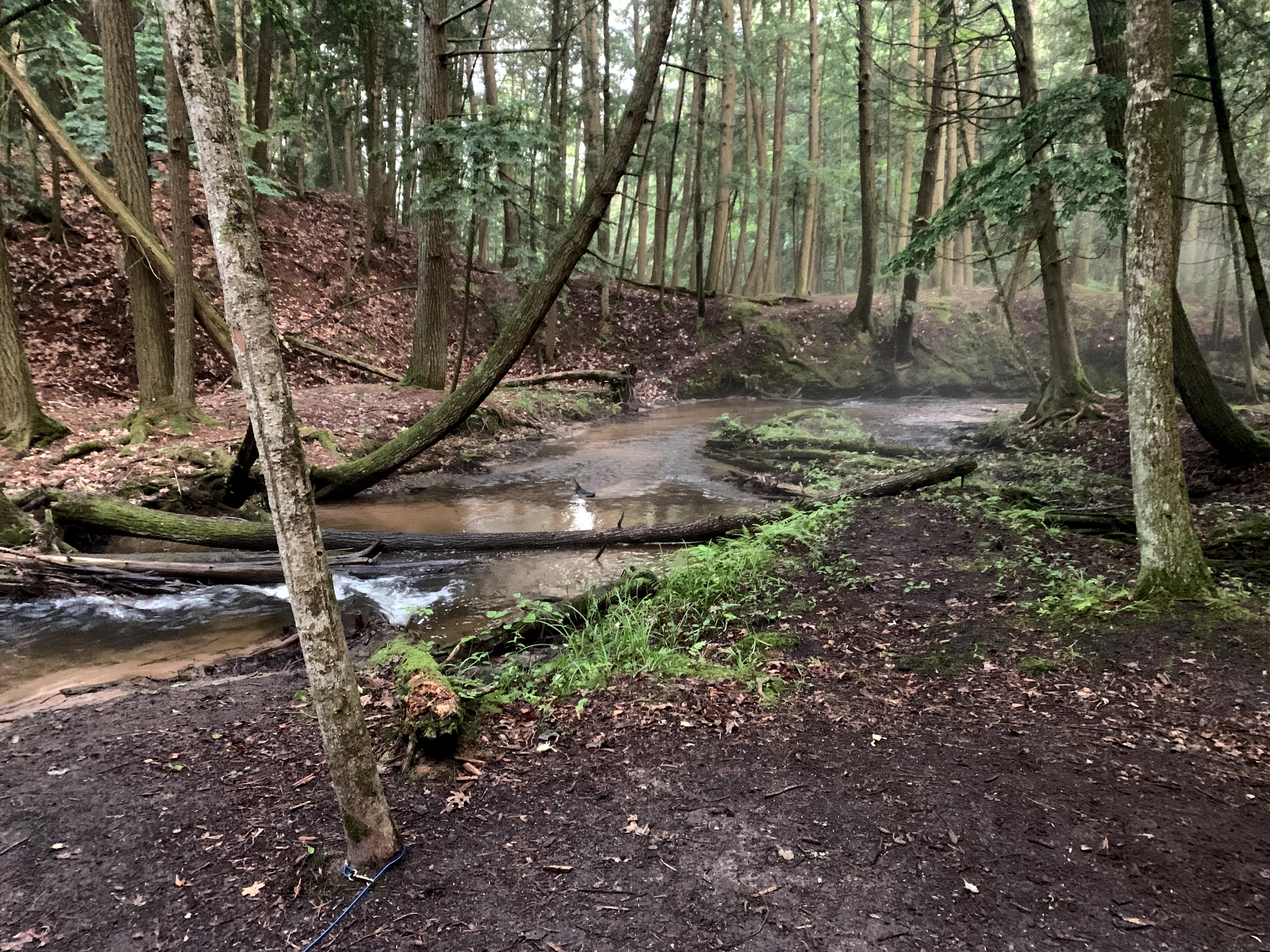 While climbing one hill, water was streaming down the side in a muddy mess. The hill was a bit steep to the down side, but muddy to the upside. Taking slipping as a precaution I went for the muddier upside and Bessie and I made it across. Another one of those clench moments hoping everything goes right. My new trail runners were officially baptized on the trail. I never expected them to stay clean.
